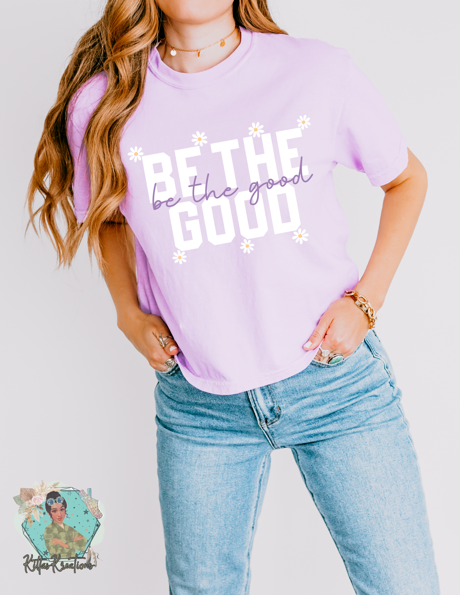 Orchid comfort colors boxy tee with Be the Good on the front.