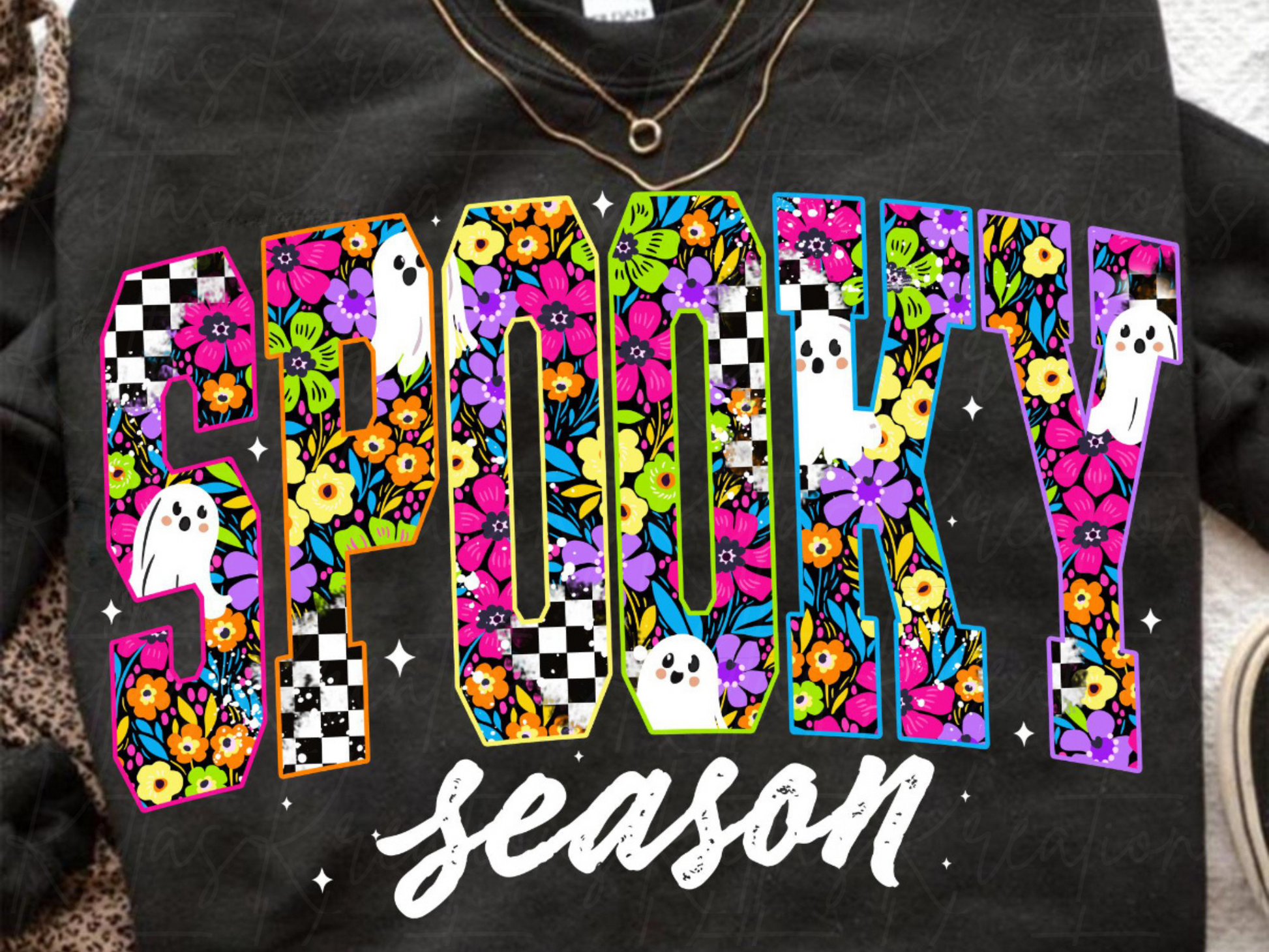 Black crewneck with bright and colorful spooky design heated pressed on.